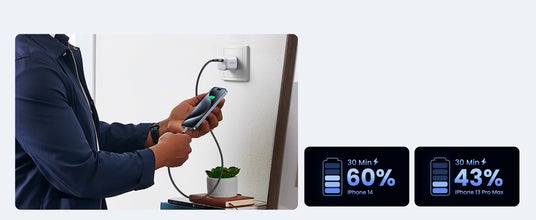 USB-C PD 3.0技術で驚きの高速充電UGREEN Nexode USB-C GaN 急速充電器は、USB-C PD 3.0技術を活用し、最新のスマートフォンをこれまでにないスピードで充電できます。例えば、iPhoneを0%から60%まで約30分で充電可能(※iPhone 14の場合)。この驚くべき効率は、忙しい日々にピッタリです。