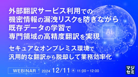マジセミ株式会社は「外部翻訳サービス利用での機密情報の漏洩リスクを防ぎながら既存データの学習で専門領域の高精度翻訳を実現」というテーマのウェビナーを開催します。