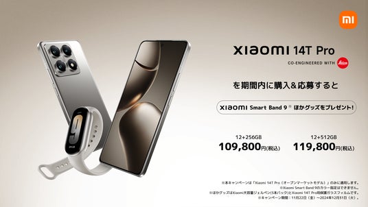 概要 :Xiaomi 14T Proの発売を記念し、期間内に購入&応募するお客様にもれなく「Xiaomi Smart Band 9」と他にグッズをプレゼントするキャンペーンを実施。