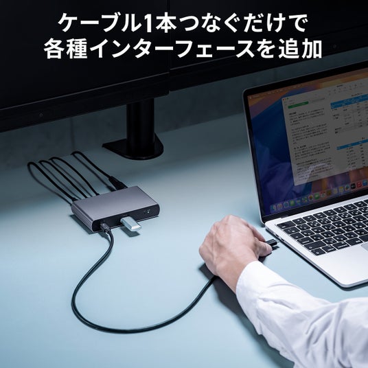 本製品は、ケーブル1本で最大2画面の映像出力(Thunderbolt4出力)ができるThunderbolt4ドッキングステーションです。