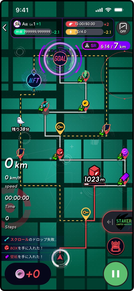 ゲームを開始すると自動的に生成されるマップで、ユーザーは単なる運動ではなく、まさにゲームの世界を散策するような体験ができます。「鍵アイテム」を使えばマップのルートを変更できたり、欲しいアイテムのスポットを通るように自分好みのコースを設定できたりします。そのほかにも攻略性のある要素も用意しているので、毎回異なる体験が楽しめます。