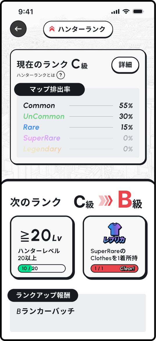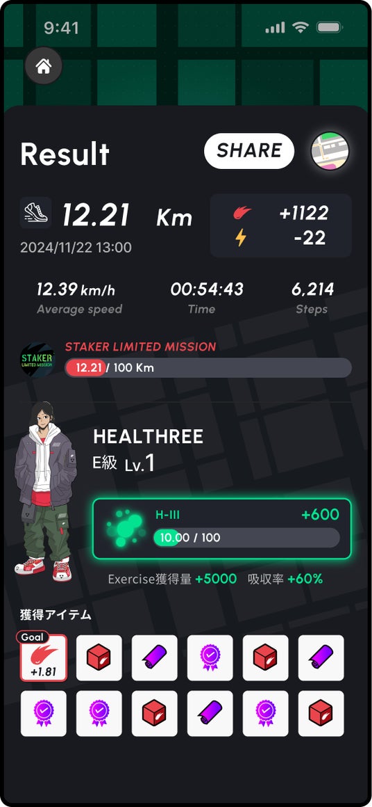 運動距離に応じて「H-III(ゲーム内の経験値)」が獲得できます。H-IIIが貯まるとユーザーがレベルアップし、レベルに応じてランクを上げることができます。また、ランクに応じてマップクリア時の報酬も増加します。マップのゴールに到達すれば追加報酬が得られるため、達成感を感じながら運動習慣を育むことができます。