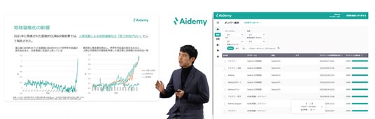 Aidemyの画面の例(左:Aidemy GX|法人向けの実際のコースの様子, 右:利用者向けの管理画面イメージ)
