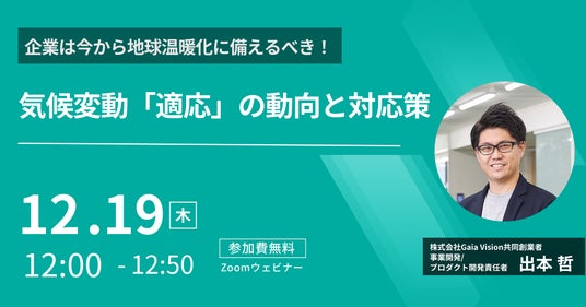 シリーズ第3回目は、株式会社Gaia Vision 出本 哲氏をお招きし、「企業は今から地球温暖化に備えるべき!気候変動『適応』の動向と対応策」をテーマに12月19日に開催します。
