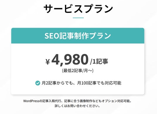 AI技術で1記事4,980円(※月2記事~)という価格を実現。それでも品質には妥協しません。月々たった9,960円から始められる「成果重視のSEO」。