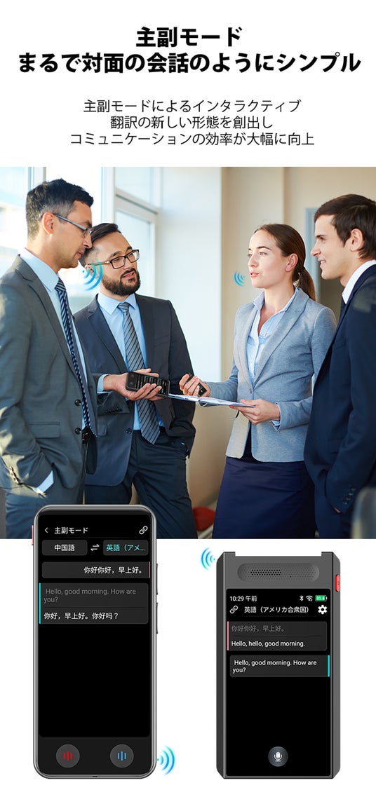 ビジネスシーンや旅行、留学など、さまざまな場面での言語障害を突破!言語の壁を超えたスムーズなコミュニケーション!AIのスマートパワーで、98%の精度を誇り、リアルタイムで正確な翻訳を実現します!