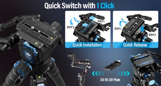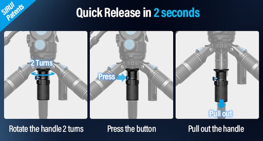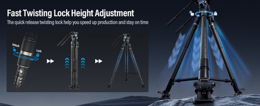 従来のノブやフリップレッグロックセットアップ三脚と比較して、SIRUI SVS75はワンステップ高さ調整設計です。つまり、各脚のツイストロックを1つ引くだけで三脚をセットアップしてロックできます。このワンステップ高さ調整設計により、重い機材を使用しても、高さを上下に素早く柔軟に調整できるため、素早く移動する撮影に適しています。