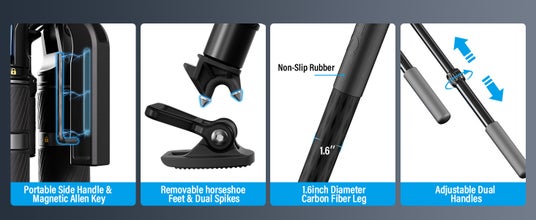 馬蹄形の脚を備えた三脚は平らな地面でもうまく機能し、三脚の安定性を高めます。接触面積を増やし、位置を制限した設計の馬蹄形の脚により、滑りがさらに防止され、三脚が安定します。
