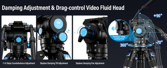 フルード摩擦と 7 段階のカウンターバランスにより、ヘッドは過酷な条件でも問題なく動作します。3+0 ダンピング調整、0-10 の負荷容量、プロフェッショナルなパンおよびチルト制御は、ハイエンドの制作に最適です。
