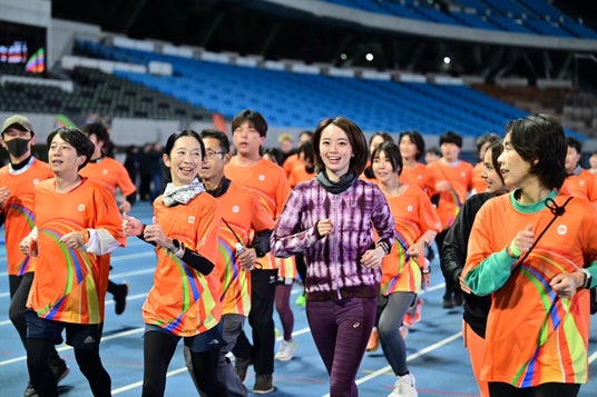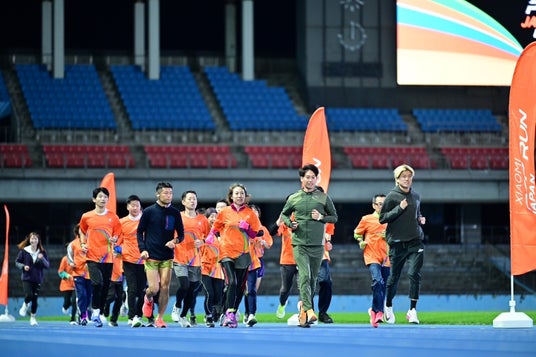 第2部では長谷川様とがんばれゆうすけ様よりストレッチとランニングフォームのレクチャーを行った後に、参加者と一緒に「等々力陸上競技場」の陸上競技場トラック5周(2,000メートル)をランニングしました。