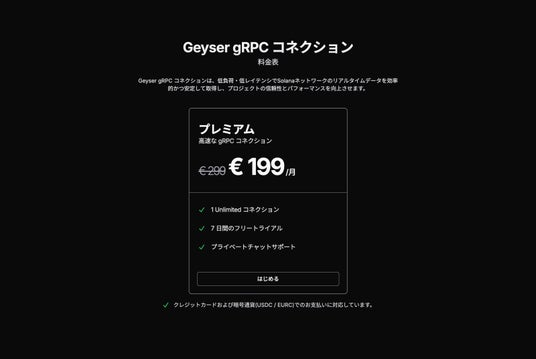 サービス提供開始を記念して、Geyser gRPC コネクションのプレミアムプランを特別価格で提供いたします。
