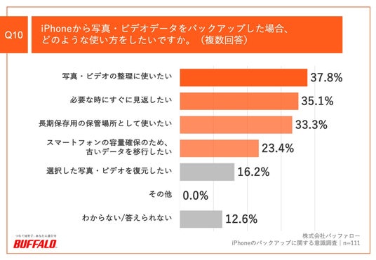 「Q10.iPhoneから写真・ビデオデータをバックアップした場合、どのような使い方をしたいですか。(複数回答)」(n=111)と質問したところ、「写真・ビデオの整理に使いたい」が37.8%、「必要な時にすぐに見返したい」が35.1%、「長期保存用の保管場所として使いたい」が33.3%という回答となりました。