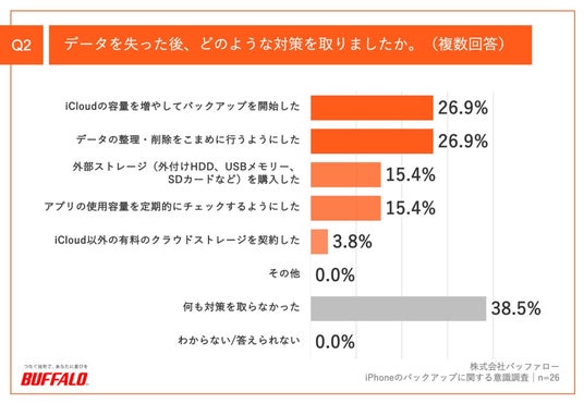 Q1で「何度もある」「一度だけある」と回答した方に、「Q2.データを失った後、どのような対策を取りましたか。(複数回答)」(n=26)と質問したところ、「iCloudの容量を増やしてバックアップを開始した」が26.9%、「データの整理・削除をこまめに行うようにした」が26.9%、「外部ストレージ(外付けHDD、USBメモリー、SDカードなど)を購入した」が15.4%という回答となりました。