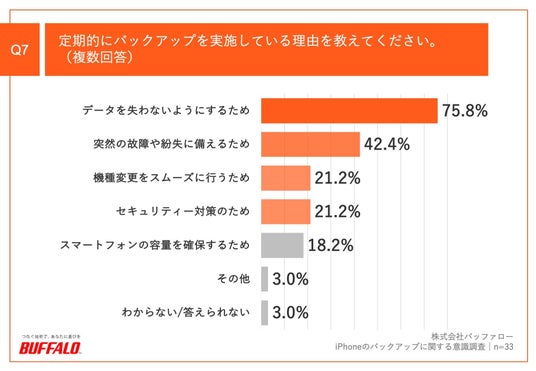 Q6で「週に1回以上」「月に1回程度」「数か月に1回程度」と回答した方に、「Q7.定期的にバックアップを実施している理由を教えてください。(複数回答)」(n=33)と質問したところ、「データを失わないようにするため」が75.8%、「突然の故障や紛失に備えるため」が42.4%という回答となりました。