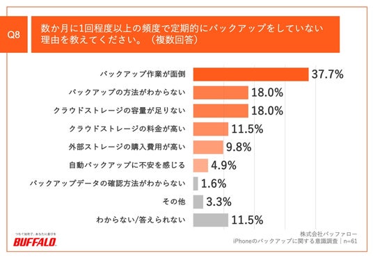 Q6で「半年に1回以下」「不定期(気が付いた時のみ)」「バックアップをしていない」と回答した方に、「Q8.数か月に1回程度以上の頻度で定期的にバックアップをしていない理由を教えてください。(複数回答)」(n=61)と質問したところ、「バックアップ作業が面倒」が37.7%、「バックアップの方法がわからない」が18.0%、「クラウドストレージの容量が足りない」が18.0%という回答となりました。