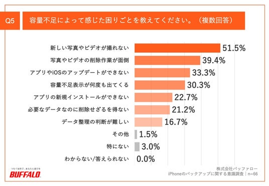 Q4で「ある」と回答した方に、「Q5.容量不足によって感じた困りごとを教えてください。(複数回答)」(n=66)と質問したところ、「新しい写真やビデオが撮れない」が51.5%、「写真やビデオの削除作業が面倒」が39.4%、「アプリやiOSのアップデートができない」が33.3%という回答となりました。