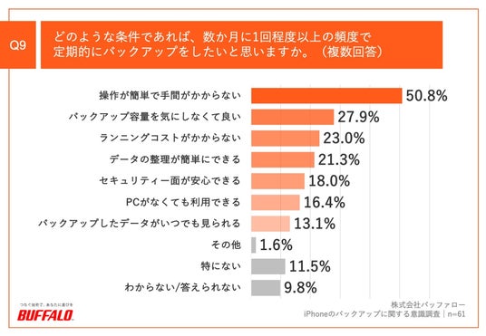 Q6で「半年に1回以下」「不定期(気が付いた時のみ)」「バックアップをしていない」と回答した方に、「Q9.どのような条件であれば、数か月に1回程度以上の頻度で定期的にバックアップをしたいと思いますか。(複数回答)」(n=61)と質問したところ、「操作が簡単で手間がかからない」が50.8%、「バックアップ容量を気にしなくて良い」が27.9%、「ランニングコストがかからない」が23.0%という回答となりました。