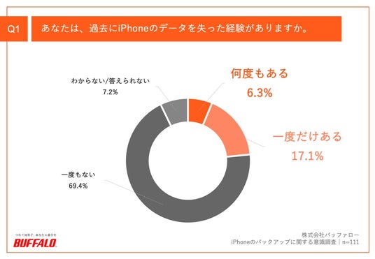 「Q1.あなたは、過去にiPhoneのデータを失った経験がありますか。」(n=111)と質問したところ、「何度もある」が6.3%、「一度だけある」が17.1%という回答となりました。