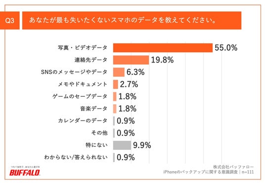 「Q3.あなたが最も失いたくないスマホのデータを教えてください。」(n=111)と質問したところ、「写真・ビデオデータ」が55.0%、「連絡先データ」が19.8%、「SNSのメッセージやデータ」が6.3%という回答となりました。