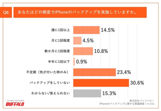 「Q6.あなたはどの頻度でiPhoneのバックアップを実施していますか。」(n=111)と質問したところ、「バックアップをしていない」が30.6%、「不定期(気が付いた時のみ)」が23.4%という回答となりました。