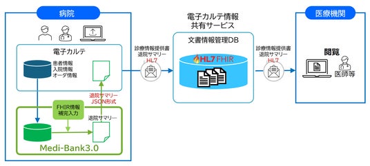 「Medi-Bank」は2000年4月に販売開始し、現在1,000超の医療施設に導入されている診療情報管理システムではシェアNo. 1(※2)の製品です。本サービスは病院の電子カルテシステムや他部門システムより、各種の医療情報を取得し退院サマリ―を作成します。