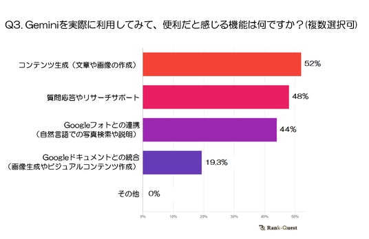 次いで、「質問応答やリサーチサポート」が48%、「Googleフォトとの連携(自然言語での写真検索や説明)」が44%となっています。「Googleドキュメントとの統合(画像生成やビジュアルコンテンツ作成)」は19.3%に留まりました。