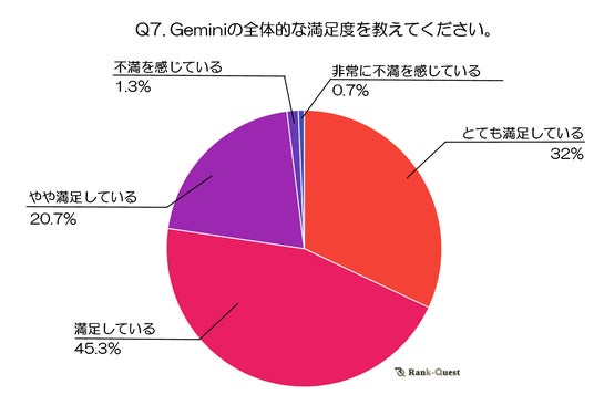 Geminiの全体的な満足度について「満足している」と回答した方が最も多く、全体の45.3%を占めました。次いで、「とても満足している」が32%、「やや満足している」が20.7%となっています。