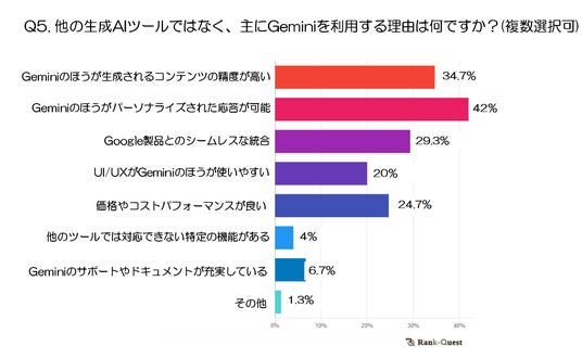 次いで、「Geminiのほうが生成されるコンテンツの精度が高い」(34.7%)、「Google製品とのシームレスな統合」(29.3%)が続きます。