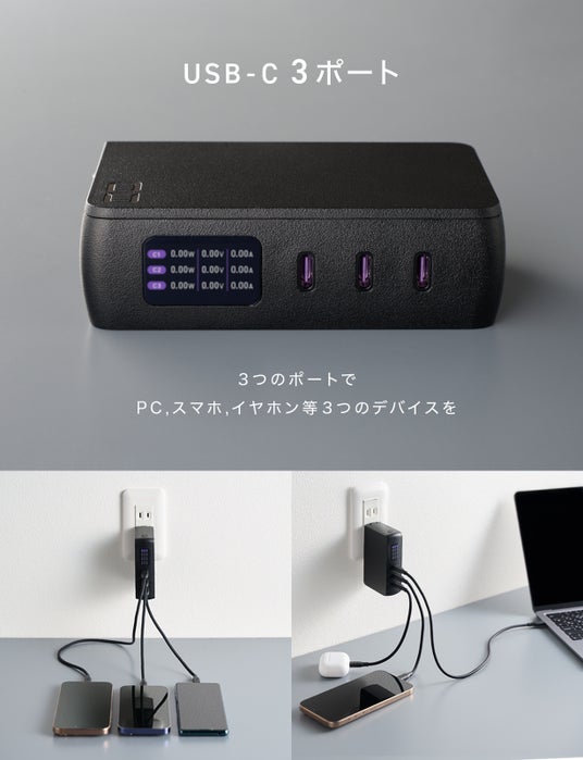 最大67W出力、USB-C×3ポート搭載の急速充電器と、高出力モバイルバッテリーが一体化。