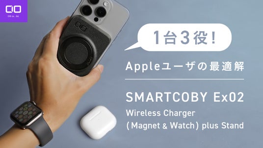 株式会社CIO(本社:大阪府守口市)は、応援購入サービス「Makuake」にて約1,400万円を超えるご支援をいただき製品化した、iPhoneもApple Watchも充電可能なモバイルバッテリー『SMARTCOBY Ex02 Wireless Charger(Magnet & Watch) plus Stand』をAmazon.co.jpにて5,980円(税込) にて11月27日より予約販売を開始いたします。