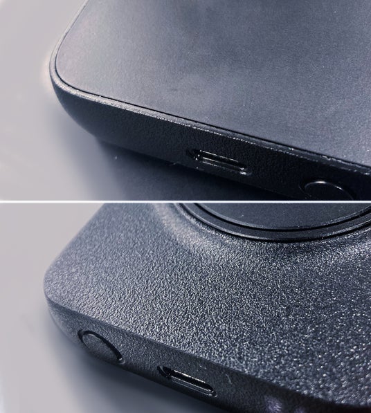 表面には一眼レフカメラのボディのような粗いシボ加工を施しており、
