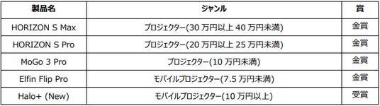 受賞理由:ポータビリティに優れた、入門者にも最適な高画質・高音質スタンド一体型プロジェクターに対して