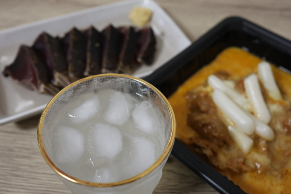 今回「いよかん」フレーバーと合わせた食事は鰹のたたきと、チーズタッカルビ。
