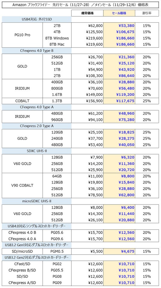 ProGrade Digital Inc.は、Amazonで11月27日(水)0時から11月28日(木)23時59分にかけて開催される先行セール、11月29日(金)0時から12月6日(金)23時59分にかけて開催されるブラックフライデーセールに参加します。両方の期間を通じ15-25%OFFのセール価格でご購入いただけます。ただし、在庫がなくなり次第終了となります。