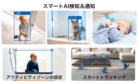 - スマートAI検知:AIが多彩な動きやイベントを検知し、アプリを通じてお知らせします。