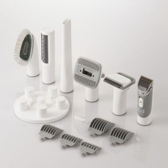 ■散らかりやすい抜け毛を瞬時に吸引し、お部屋をキレイに保ちながらお手入れ可能。専用のバリカンが付属し、6種類のヘッドを付け替えて使えるトリミング・グルーミングキットです。
