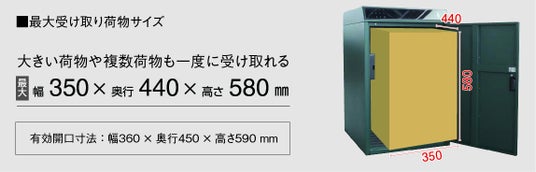 大きい荷物や複数荷物も一度に受け取れる内部空間で、最大幅350、奥行440、高さ580mmの荷物が受け取り可能。(有効開口寸法:幅360、奥行450、高さ590mm)