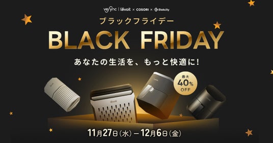 アメリカ発の小型家電メーカーのVeSync(ウィーシンク) Co., Ltd(本社:アメリカ カリフォルニア州)は、11月27日(水)~12月6日(金)の間、人気製品「Levoit空気清浄機」「COSORIノンフライヤー」を始め、最大40%OFFのブラックフライデーセールをVeSync公式ストア、Amazon公式ストアにて開催いたします。