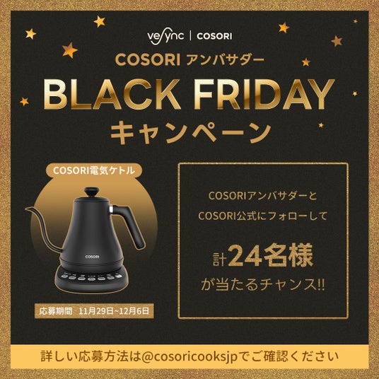 2024年11月29日(金)~2024年12月6日(金)期間中に「COSORIアンバサダー Black Fridayキャンペーン」も同時開催する予定です。各COSORIアンバサダーのフォロワー様から抽選で2名様に「COSORI電気ケトル」が当たります。合計24名様にプレゼントいたします。
