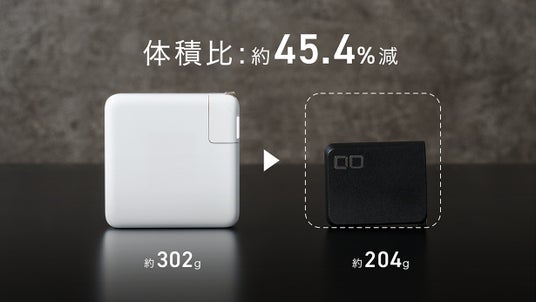 従来の96WのAC充電器と比較すると、その差は歴然です。体積比約45.4%減となり約半分の小ささでありながら、2ポート搭載で合計120Wの高出力を実現しています。軽量化も実現し従来の96WのAC充電器からは約98gも軽く、約2/3の重量になりました。