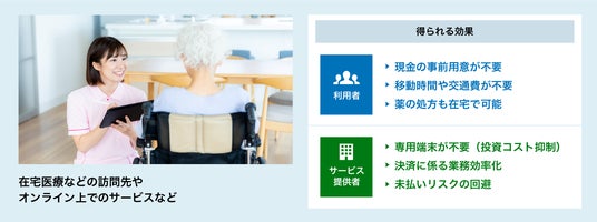 例えば、高齢化が進む日本において、今後の利用拡大が見込まれる在宅医療の現場でキャッシュレス決済を行う場合、従来であれば訪問先で利用できる専用決済端末が必要でしたが、登録型継続課金サービス(リカーリング)により、利用者が決済するクレジットカード情報を事前に登録することで、クレジットカードや専用の決済端末がなくとも支払いが可能になります。多くの訪問サービス員を抱えるサービス提供者は専用決済端末の準備コストを抑制でき、また利用者は急を要する診察でも事前に現金を用意する必要がないため、心理的な負荷が軽減されます。