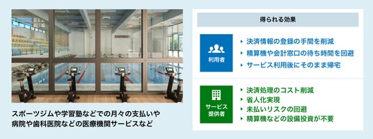 さらに今後は対面・非対面のハイブリッド決済サービスを展開する予定です。病院での入院時の初診料など初回決済時にクレジットカードの登録情報と診察券番号/会員番号等の個人情報を紐づけることで、2回目以降の決済はカード不要で自動課金が可能となる「持たない・待たない」決済サービスを提供します。繰り返し施設に訪問してサービスをうけるサブスクリプション料金体系のスポーツジムや学習塾の月謝の支払いや、入院費の定期的な精算、さらに支払い窓口で待ち時間を要する病院や歯科医院などの医療機関でもご利用いただけます。サービス提供者の決済処理業務を効率化するだけでなく、利用者の拘束時間を短縮することで顧客体験価値の向上に寄与します。