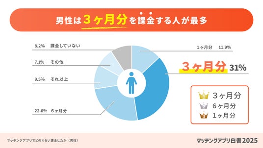 男性を対象にマッチングアプリにどの程度課金したか調査すると、「3ヶ月分」と回答した人が最多となりました。