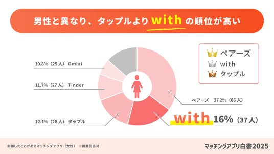 ただ、男性の場合は、男女ともに無料で使える特徴がある「Tinder」が2位、女性の場合は価値観重視で相手を探すことができる「with」が2位でした。