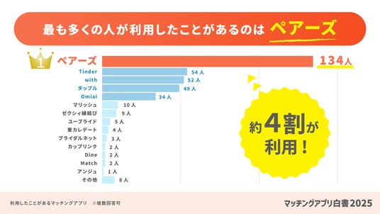 - 最も多く利用されていたマッチングアプリは男女ともに「ペアーズ」