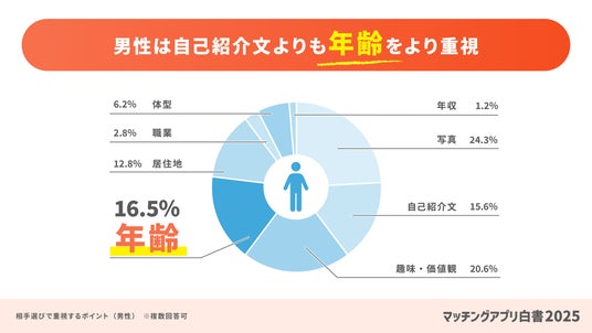 男女別で集計すると、男性が自己紹介文より年齢をより重視する傾向や、女性が男性よりも職業や年収を重視する傾向などが見られました。