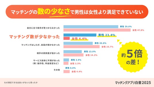 - 女性より男性の方がマッチングの数が少ないために満足のいく出会いがなかったと感じている