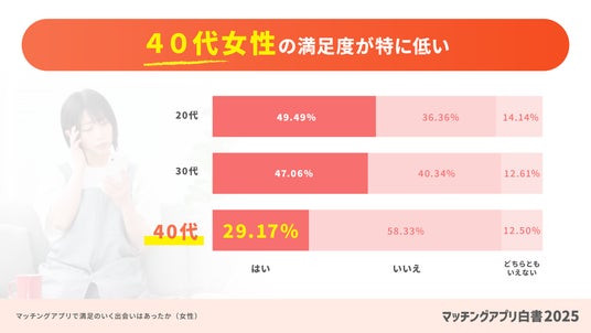 また、40代の結果に注目すると、男性は41%が「満足のいく出会いがあった」と回答しているのに対し、女性は29%と大きな差が出ています。