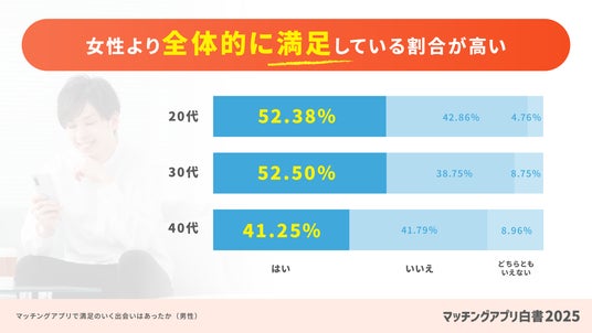 - 女性より男性の方がマッチングアプリを通して満足のいく出会いがあったと感じている