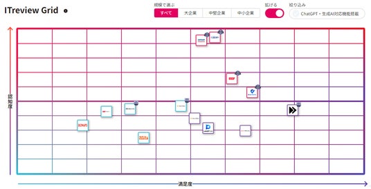 B2B向け IT製品/SaaSのレビュープラットフォーム「ITreview(アイティレビュー)」を運営するアイティクラウド株式会社(本社:東京都港区、代表取締役社長 兼 CEO:黒野 源太)は、ソフトウェアやSaaSにとどまらず企業課題解決のための各種テクノロジーサービスを掲載し、ユーザーレビューや、満足度と認知度を掛け合わせた四象限のポジショニングマップ「ITreview Grid(アイティレビューグリッド)」を公開しました。